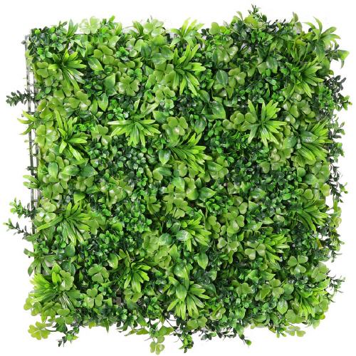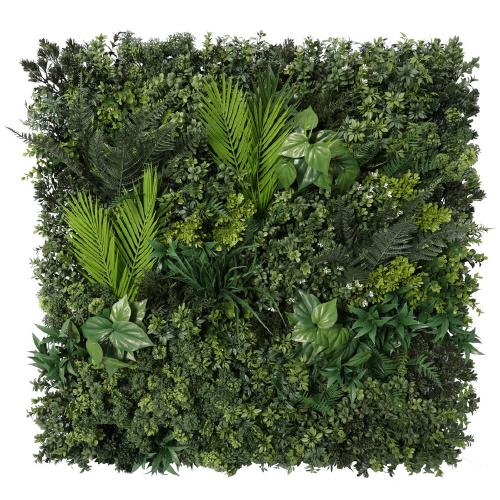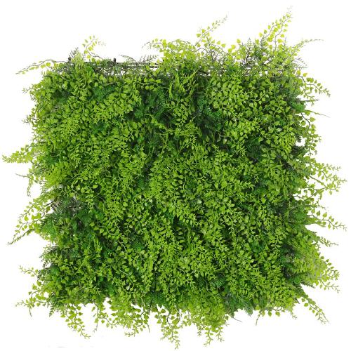 An artificial green wall panel, UV safe & FR (fire retardant) with an ingenious suspension system, this system keeps the wall a few centimeters away from the wall, so that mold does not stand a chance, through air supply behind the wall along.